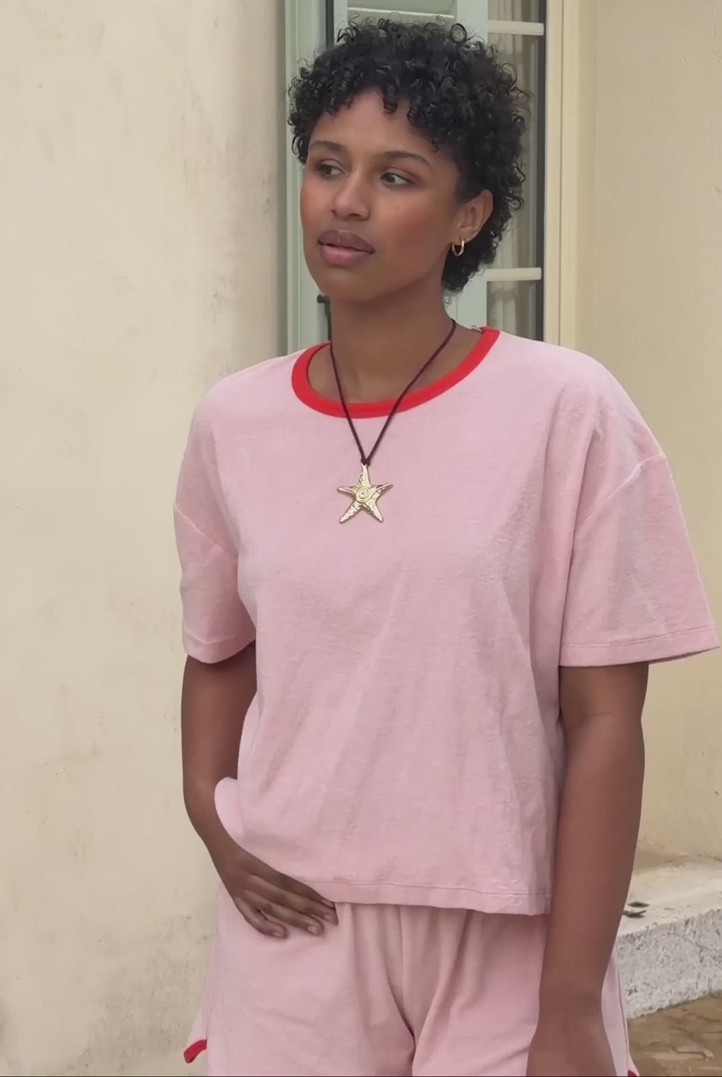 If there is one item (or rather two!) to pack in your suitcase this summer, it is this pink terry cloth set, delicately edged with a red color.